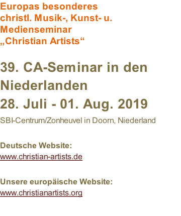 Hinweis für Künstler und die es noch werden wollen: Die folgenden Angebote sind nur ein kleiner Teil (allerdings ein guter) dessen, was es auf der Welt an guten christl. Schulungsangeboten gibt. Besonders interessant für die Künstler, die sich weiterbilden möchten, die voneinander lernen möchten, die Gemeinschaft und Austausch mit anderen Künstlern haben möchten. Alle Angebote sind für begabte Amateure und Profis. Jeder ist herzlich willkommen!