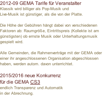 GEMA-Gebühren - Gebühren für Konzerte Infos von Music with Message. Wichtig: die meisten Gemeinden, die zu einem Verband gehören, haben Sonderabmachungen mit der GEMA vereinbart - bitte im Verband nachfragen.