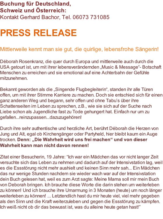Déborah ist eine begabte und charismatische Sängerin, die schon mit 17 Jahren bei den Continental Singers als jüngste Solistin aufgetreten ist. Die letzten Jahre machte sie eine steile Gesangskarriere.
