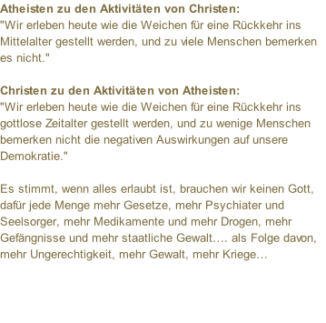Beides hat Konsequenzen für unser Leben. Darüber wird sich jeder Gedanken machen müssen. Das Ergebnis dieser Gedanken wird unser Leben, unsere zwischenmenschlichen Beziehungen, unseren Beruf, die Kindererziehung, unsere Hilfsbereitschaft und Freizeitgestaltung mehr oder weniger stark beeinflussen und prägen. Die Entscheidung darüber muss jeder für sich persönlich treffen. Einseitige Argumente werden zu hauf angeboten, wir bieten eine Alternative an.