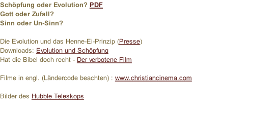 Unsere Website soll zum Nachdenken anregen. Allerdings wird unser Verstand niemals alles erklären können. Lassen sie auch ihre Seele und ihr Herz sprechen. Millionen Menschen vor uns, trafen bereits die Entscheidung für einen Schöpfergott der Bibel. Es lohnt sich das Leben dieser Menschen, was sie sagten und ihr Ende anzuschauen.